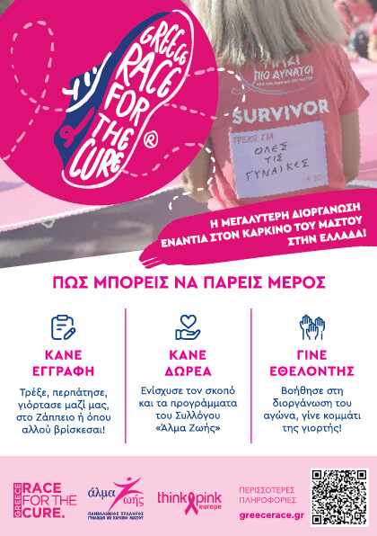 Το «Άλμα Ζωής» είναι δίπλα σε κάθε γυναίκα, κάθε μέρα του χρόνου – ενημερώνει, στηρίζει & διεκδικεί καλύτερη φροντίδα για κάθε ασθενή. Γι’ αυτό και φέτος, σας προσκαλούμε στο 17ο Greece Race for the Cure®, την Κυριακή 28 Σεπτεμβρίου στο Ζάππειο και σε κάθε γωνιά της Ελλάδας. Ελάτε να ενώσουμε τα βήματά μας, να τρέξουμε ή να περπατήσουμε και να γίνουμε το πιο δυνατό δίκτυο υποστήριξης για όλες τις γυναίκες με καρκίνο μαστού, τις οικογένειες, τους/τις φροντιστές/ριες και τους/τις φίλους/ες τους. Γιατί ΜΑΖΙ είμαστε πιο δυνατοί από τον καρκίνο του μαστού!»